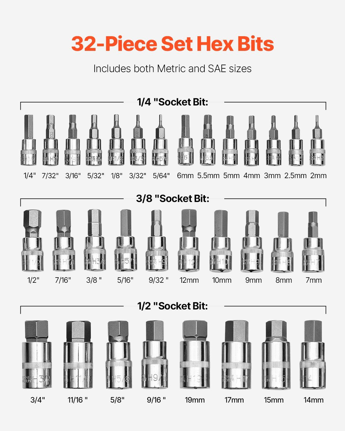 Metric & SAE Compatibility: This 32-piece extended hex socket set includes both metric and SAE sizes, covering a wide range of applications. It includes 2mm, 2.5mm, 3mm, 4mm, 5mm, 5.5mm, and 6mm with a 1/4-inch drive, 7mm, 8mm, 9mm, 10mm, and 12mm with a 3/8-inch drive, plus 14mm, 15mm, 17mm, and 19mm with a 1/2-inch drive-all in one convenient kit.