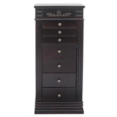 With classic and smooth lines, this jewelry cabinet is extremely attractive and functional. It can be perfectly matched with any decoration. While ensuring the elegant appearance of the product, we also have strong protection and safety. One is the brown lining to prevent your jewelry from being scratched and scratched. In addition, the anti falling design on the back can prevent the product from falling and hurting children. Here are 8 drawers to meet different placement requirements. With a mobile ring storage box at the top, it is convenient and flexible. The perfect drawer size is enough to meet your daily storage requirements for various items. There are 16 hooks on the two side doors of the jewelry cabinet, which is an excellent storage location for your necklace accessories. The hooks we choose are of simplicity style appearance and durable material, which can set off your jewelry's high quality. High quality MDF material and solid wood legs make this jewelry armoire durable and sturdy. The design of the tall legs is also relatively easy to move. It does not directly touch the ground and prevents moisture, which increases the service life of the cabinet.