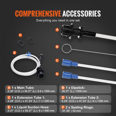 All-in-One Kit: Pop the package and find a treasure trove of tools – a 1.74 Gal/6.5L tank, a main tube, a dipstick, two extension tubes, a liquid suction hose, two sealing rings, and a user manual that gets you going. This oil extractor pump handles all sorts of fluid extractions.